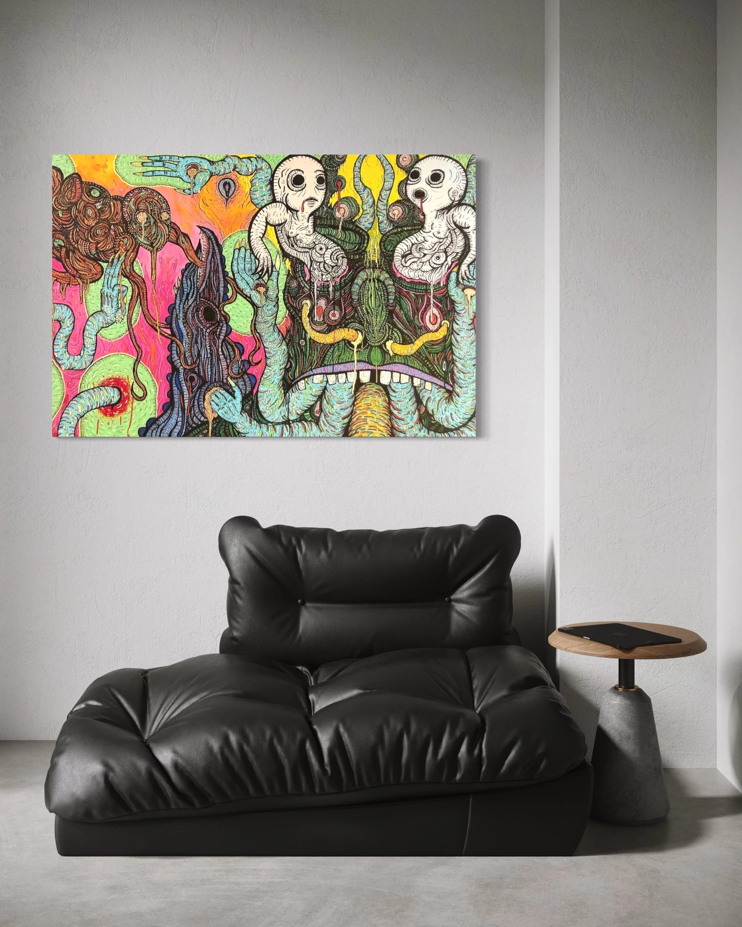 My work employs surrealism, humor, and grotesque imagery to depict aspects of the human condition and contemporary life. Each work features a character, or group of characters, engaged in an implied yet uncertain narrative. Some struggle for power, some face heartbreak and uncertainty, others are here to party, some are oppressed and horrified, and some are power hungry narcissists. While the characters and scenes depicted look fantastic and unreal, they are intended to depict real human emotions and situations (and sometimes real public figures).