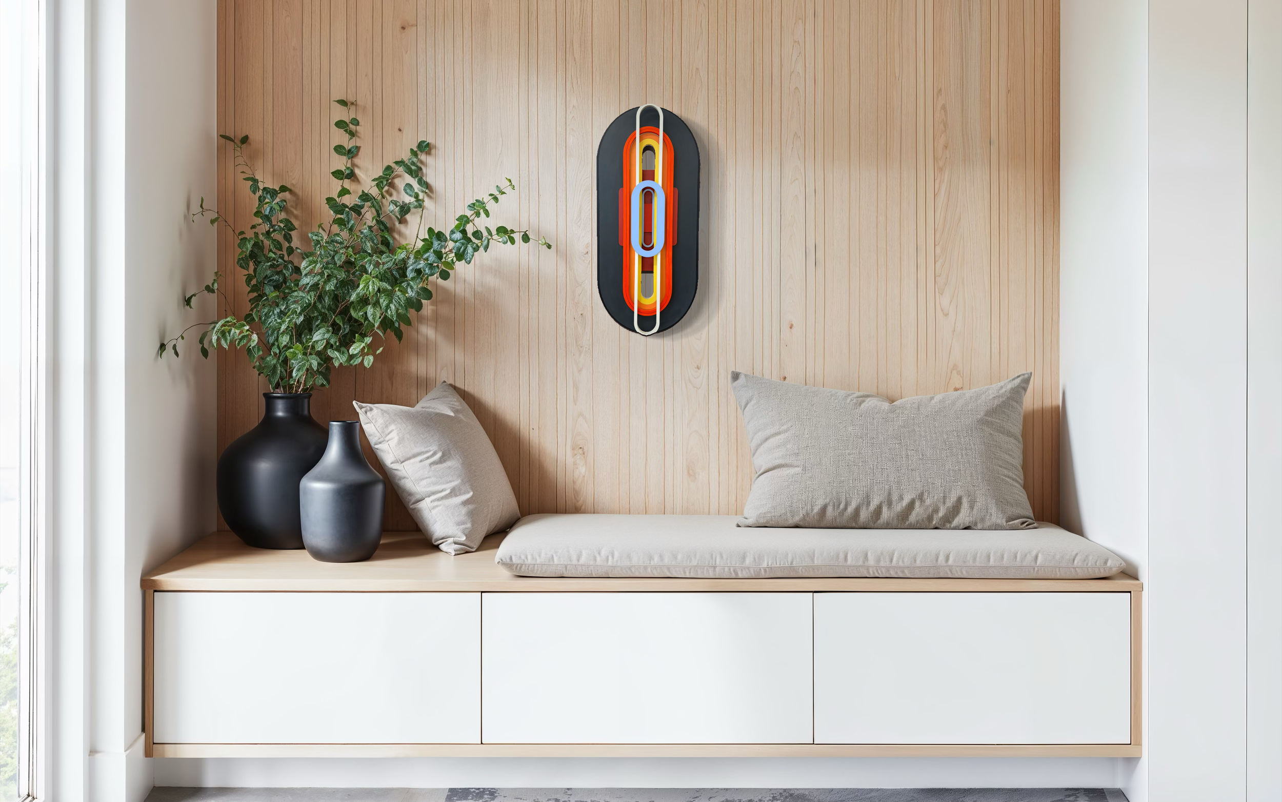 Our world is so saturated with mass production, Shirah’s hand-built ceramics offer integrity you can see and feel. Her work is a great fit across environments, from residential to businesses alike. In corporate offices, sculptural vessels and wall-mounted ceramic work introduces dimensional calm and visual rhythm—they just feel special. This importance is also essential for wellness-forward workplaces seeking inspiration without serene visual presence. In refined residential settings, we think Shirah’s elegant curved ceramics provide a nice contrast against crisp lines, adding warmth and femininity to modern minimalism or sculptural depth to transitional spaces, like hallways and entries.