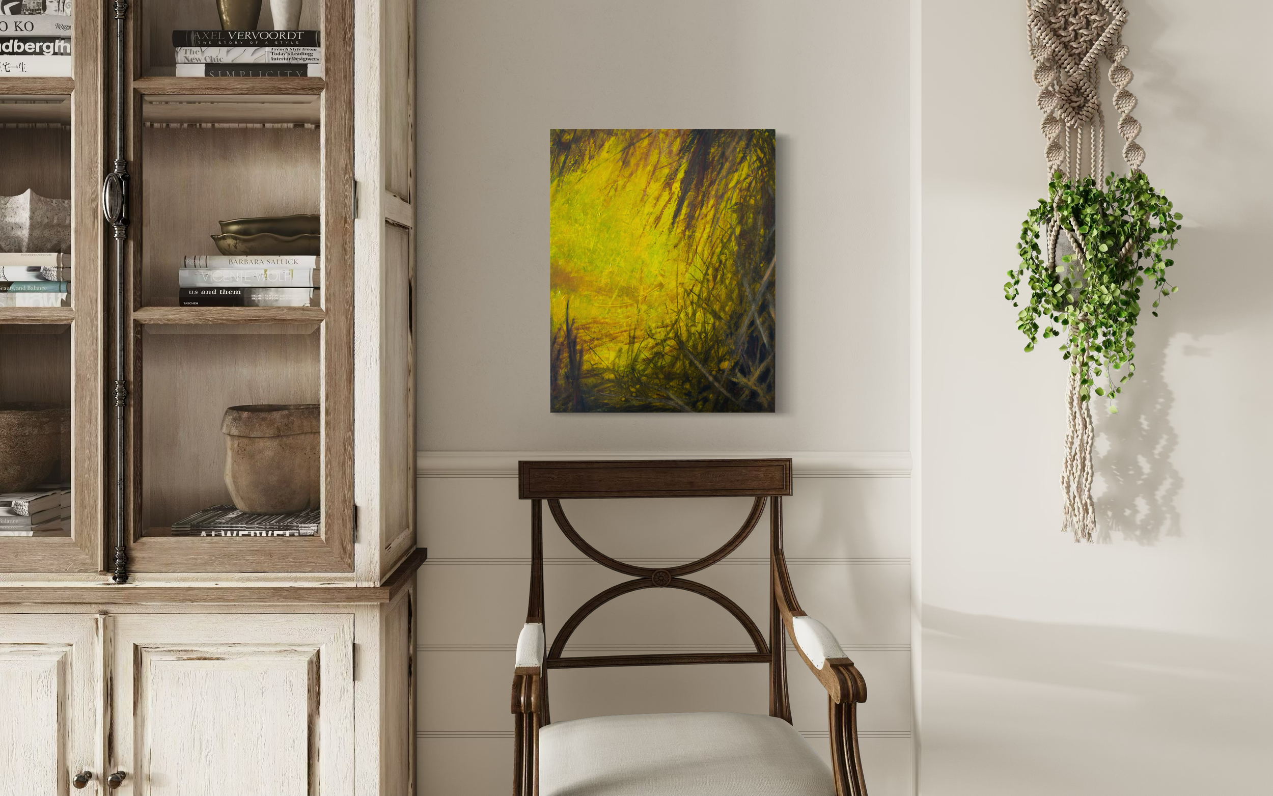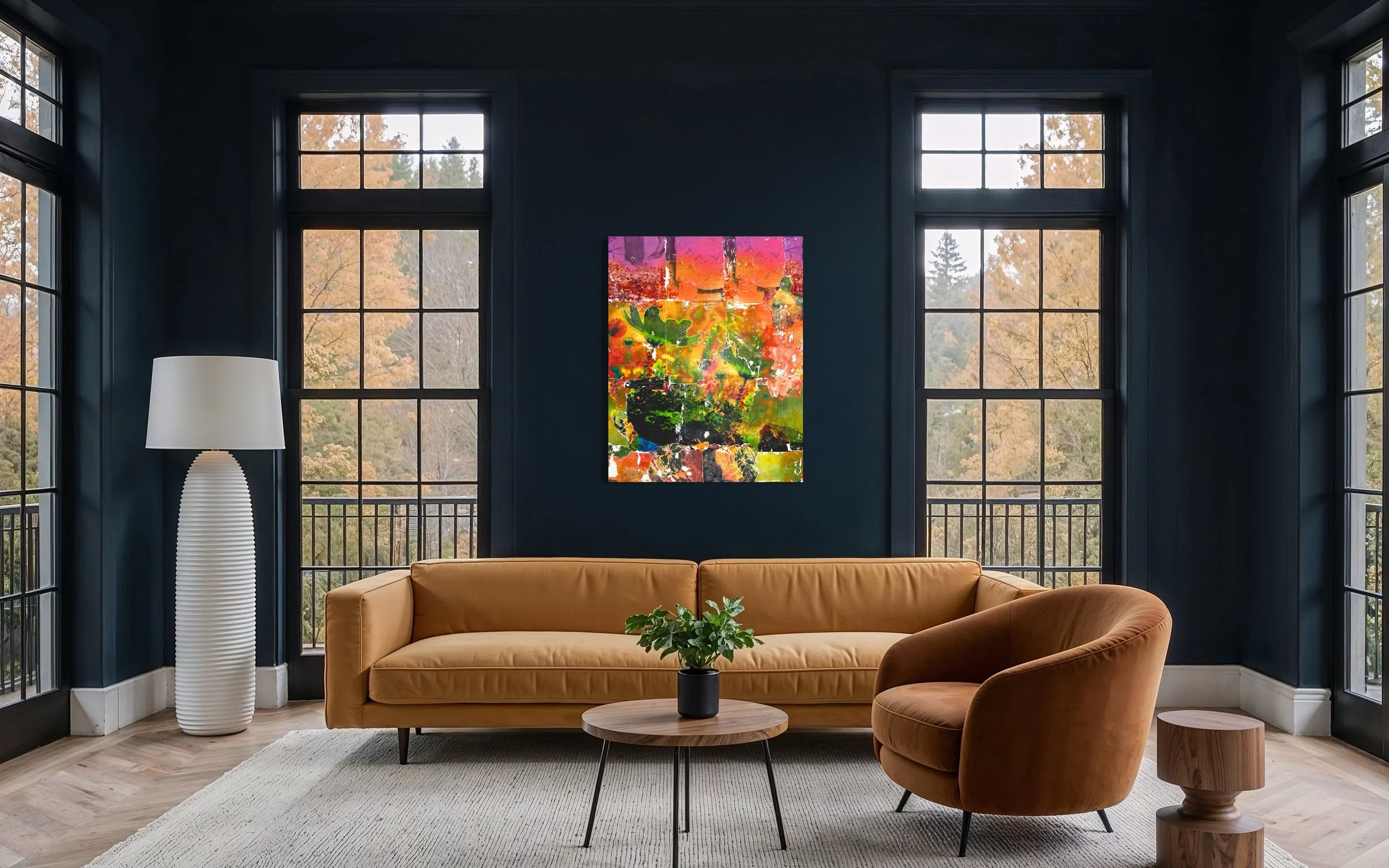 For DWELL, her expansive canvases contribute energy and presence to interior environments. The scale allows color to envelop a room, transforming walls into immersive experiences rather than passive backdrops. Her palette and mark-making are intentional and alive, creating focal points that elevate any space they are hung.