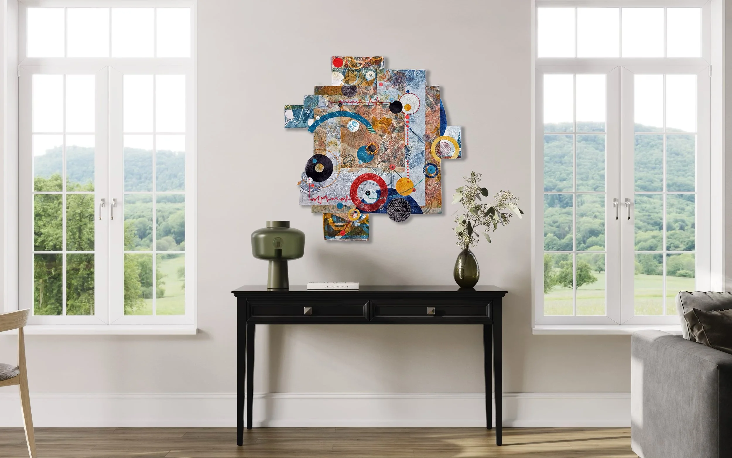 From an interior perspective, Pamela’s work carries extraordinary design versatility. The tonal subtlety and dimensional layering elevate contemporary interiors with depth and intellectual calm. In a minimalist home, her collages offer quiet structure. In a modern urban setting, they introduce organic balance and tactile intrigue. They reward proximity. They mature with the room, from a child’s nursery to a corporate foyer, the versatility is there in each piece. The trio is strong and as fun as they are stately.