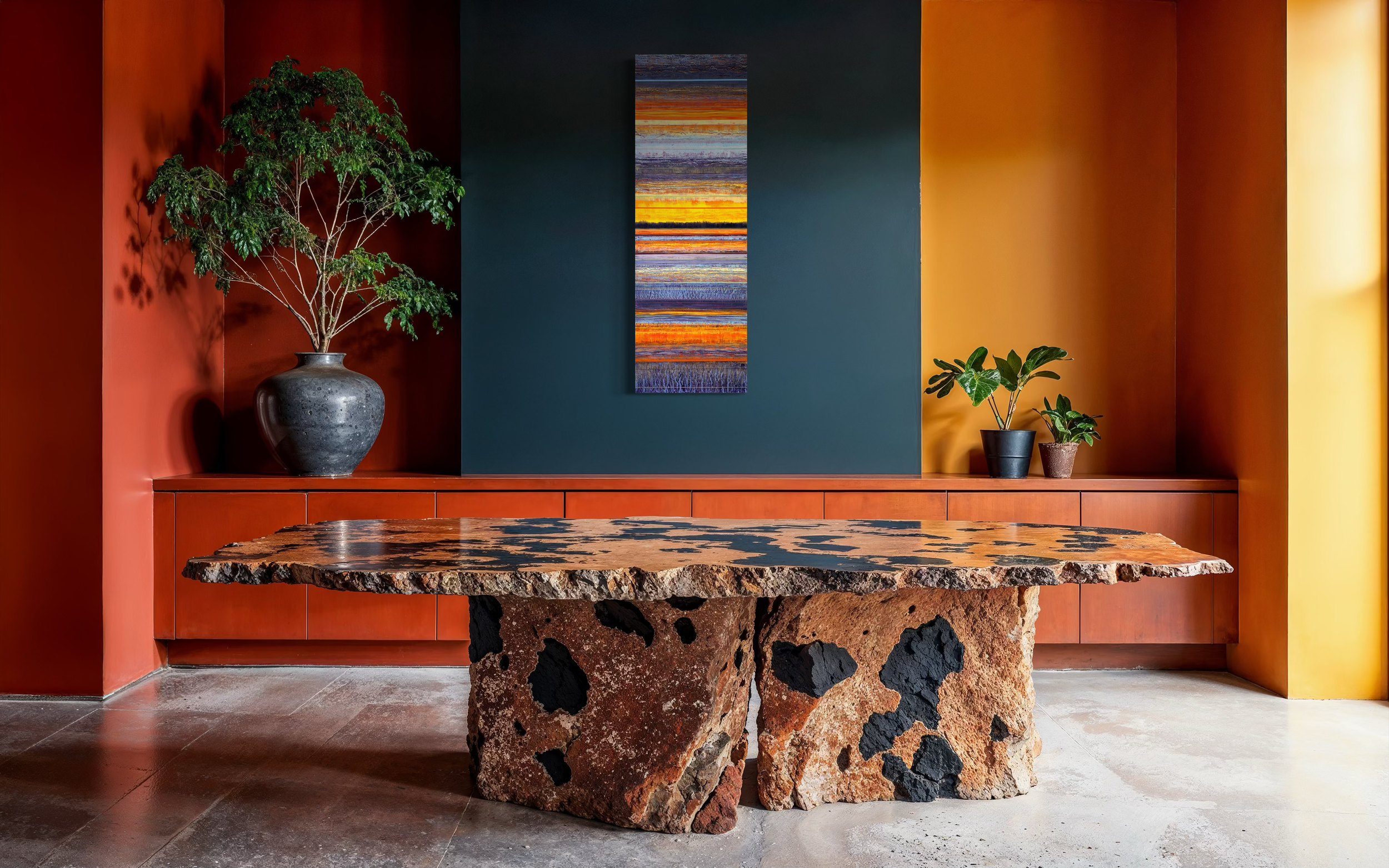 In residential interiors, the work brings architectural rhythm and visual energy to a room. The interplay of color and form creates movement while maintaining balance, allowing the paintings to function as compelling focal points that complement both modern and traditional spaces.