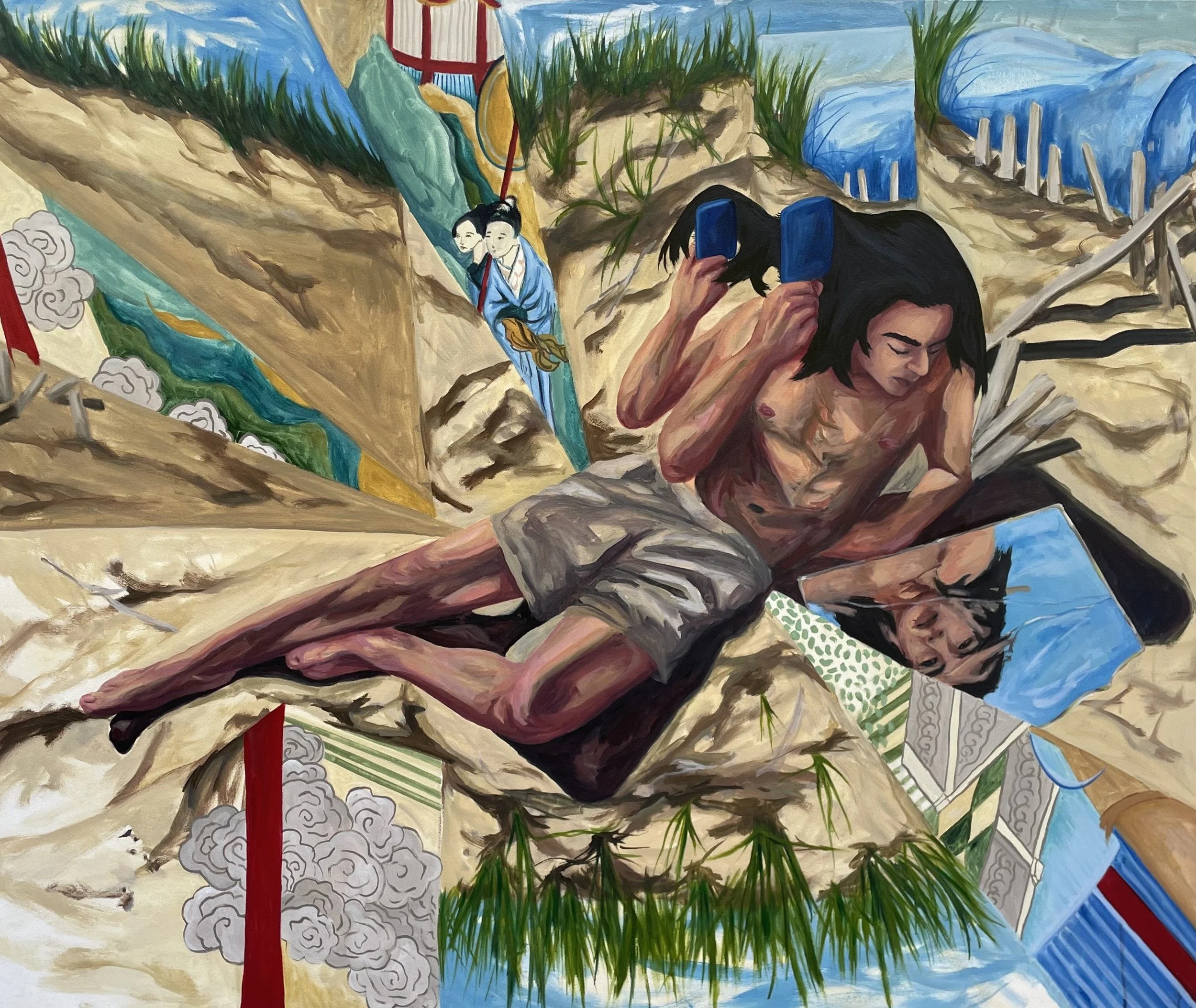 I Can Never Have It In The Way That I Want and I’m Gonna Take This One Home are the first works in a new series documenting my friends and family who identify with hybridity and experience what I call “interstitial” identity- ways of existing that are found between grains of sand, that fall between cracks, that are specific and singular, complex and overlooked. My models each experience this state of in-betweenness and unbelonging in relation to race, gender, or sexuality. The intersections of these identities further isolate and complicate their perceptions of identity until the idea of the hybrid is the most accurate and comfortable self descriptor. In these works, I juxtapose the hybrid figure against visual materials from the model’s cultural history and memories which encapsulate their sense of identity. These two portraits capture my models sharing moments of vulnerability in the humid lull of summer in New England. Through the fracturing of images, these works focus on the feelings of chaos, unrest, and self discovery that are amplified by the heat of the summer.