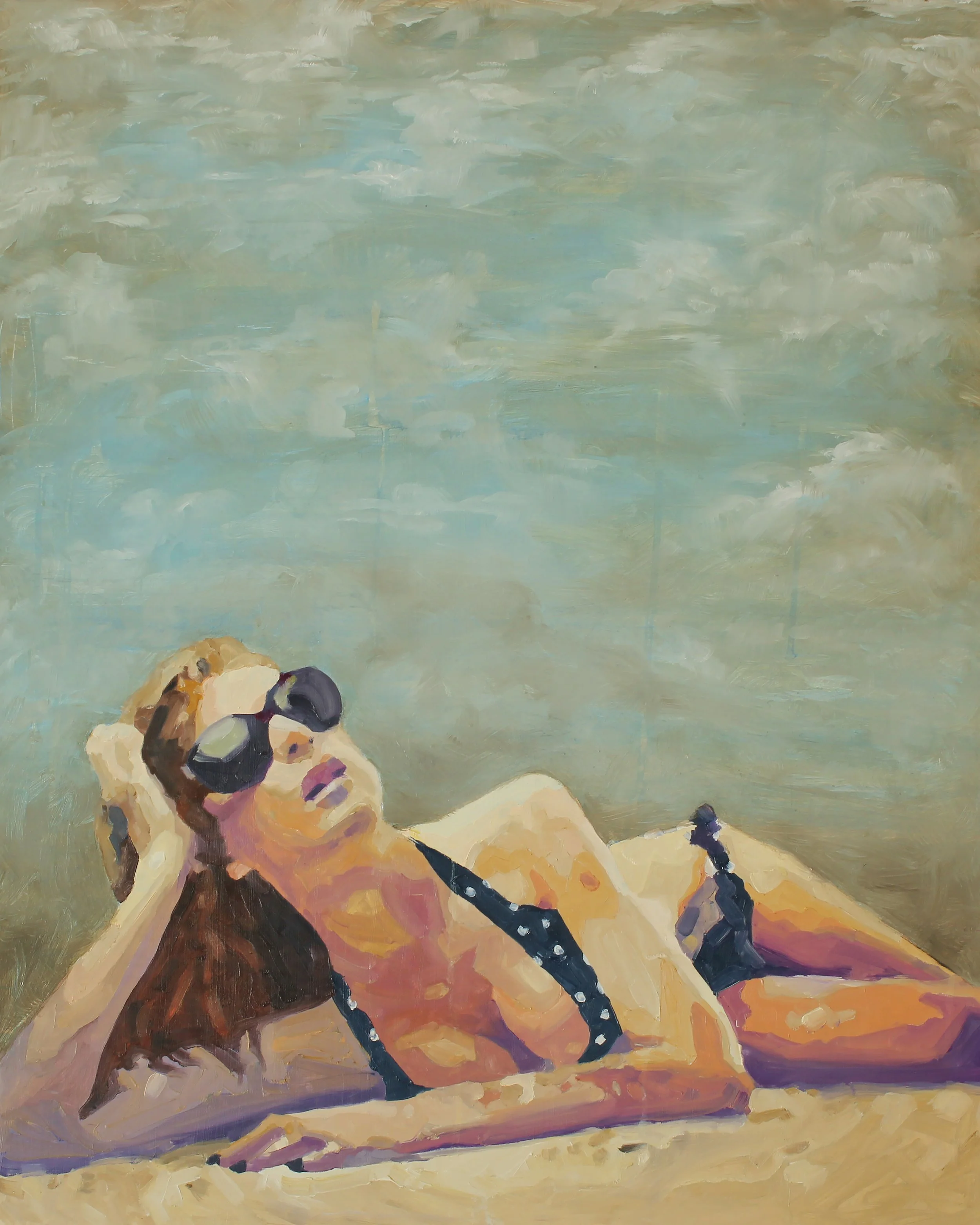 Her loose layered brush strokes are as confident as her subjects. Also inspired by fashion, color and pattern, each piece echos traces of her background in textiles, very vogue and true to her core. The finished oil pieces are luxurious and buttery to look at. If you have not seen them in person, we highly recommend seeking them out.