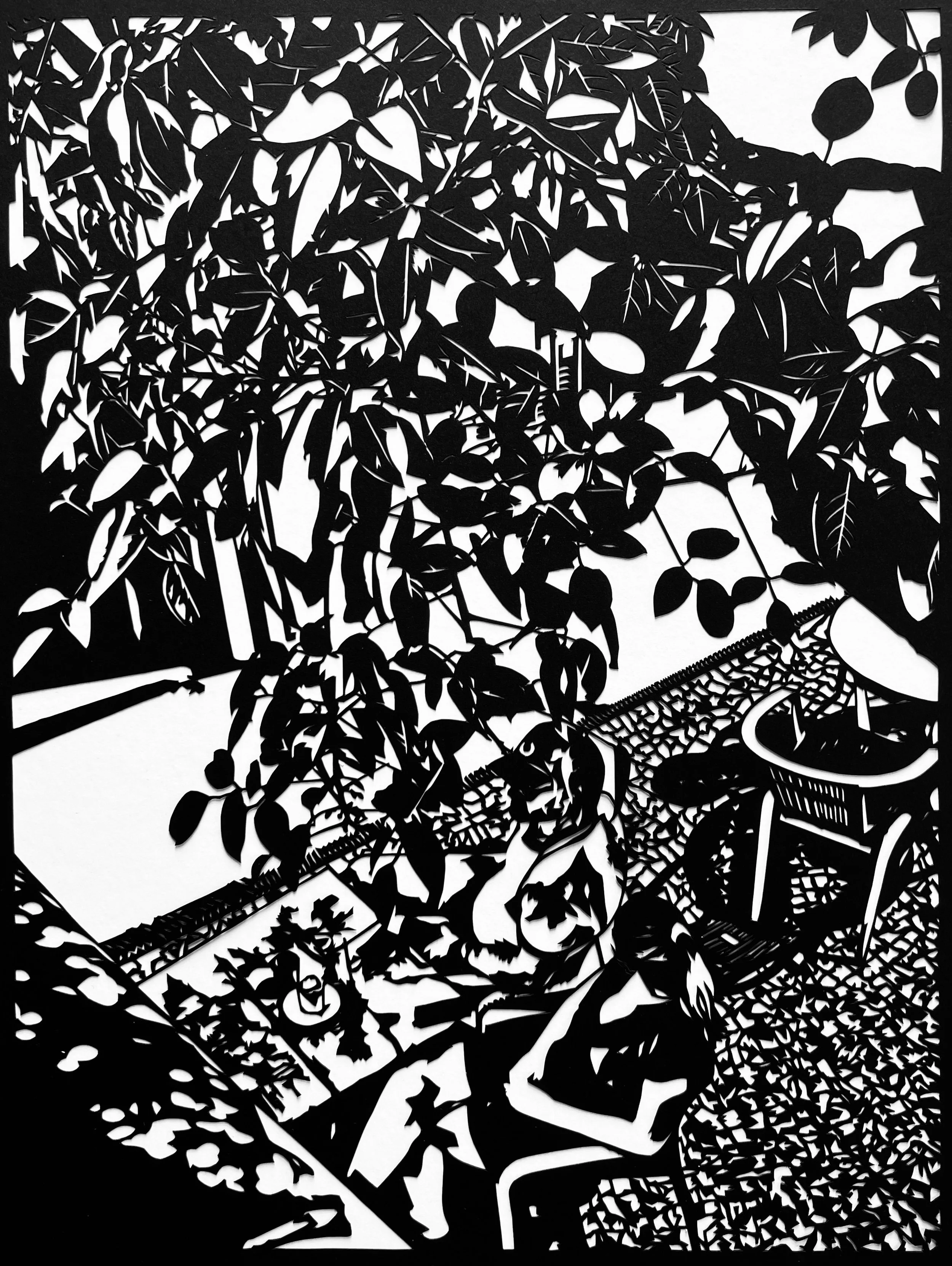 As a paper cutting artist, I strive to capture the beauty of everyday moments and the interplay of nature and human made objects in our surroundings. Each piece is constructed from a single sheet of paper, like painting with a knife. Black and white images enable me to capture both light and shadow. Paper can be unforgiving medium; it can only be cut one. Each cut serves a purpose. These pieces depict moments of pause in the summer heat and the shimmer of afternoon sun. I hope to evoke the feeling of stillness in heat, with humidity at its peak.