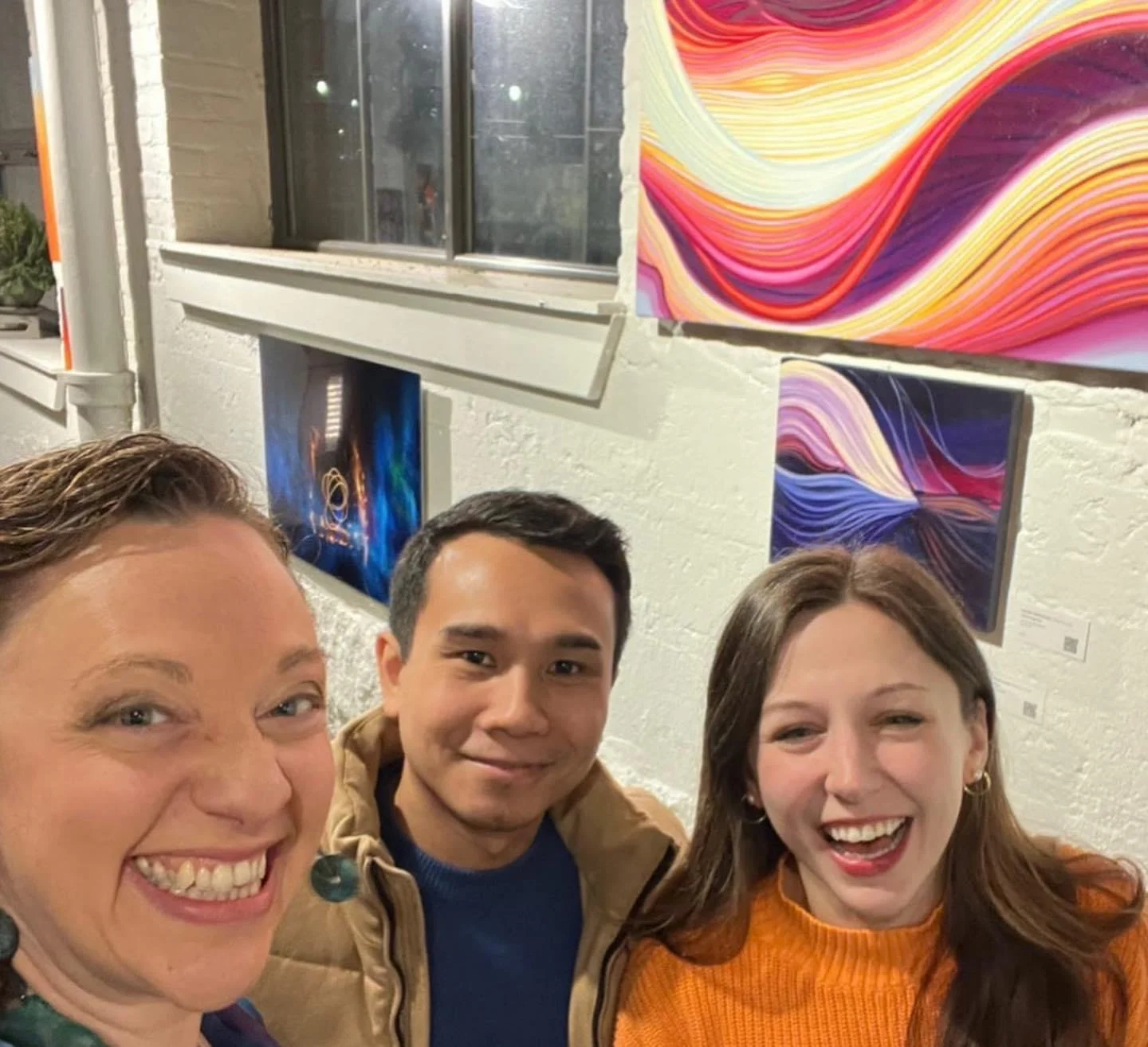 Three people posing and smiling indoors at an art gallery, with various artworks displayed on the walls behind them.