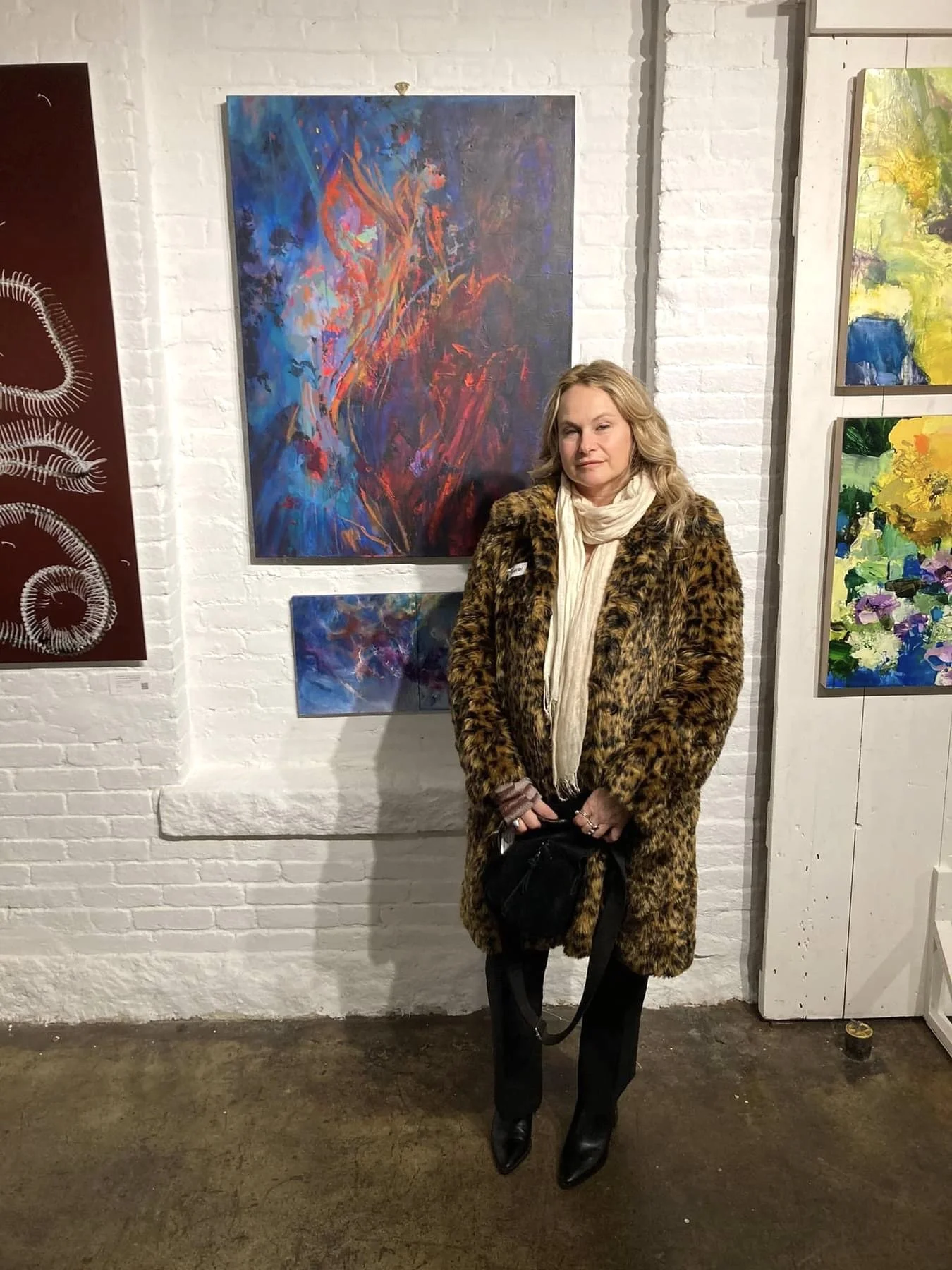 Two women smiling in an art gallery with colorful abstract paintings on the wall behind them.