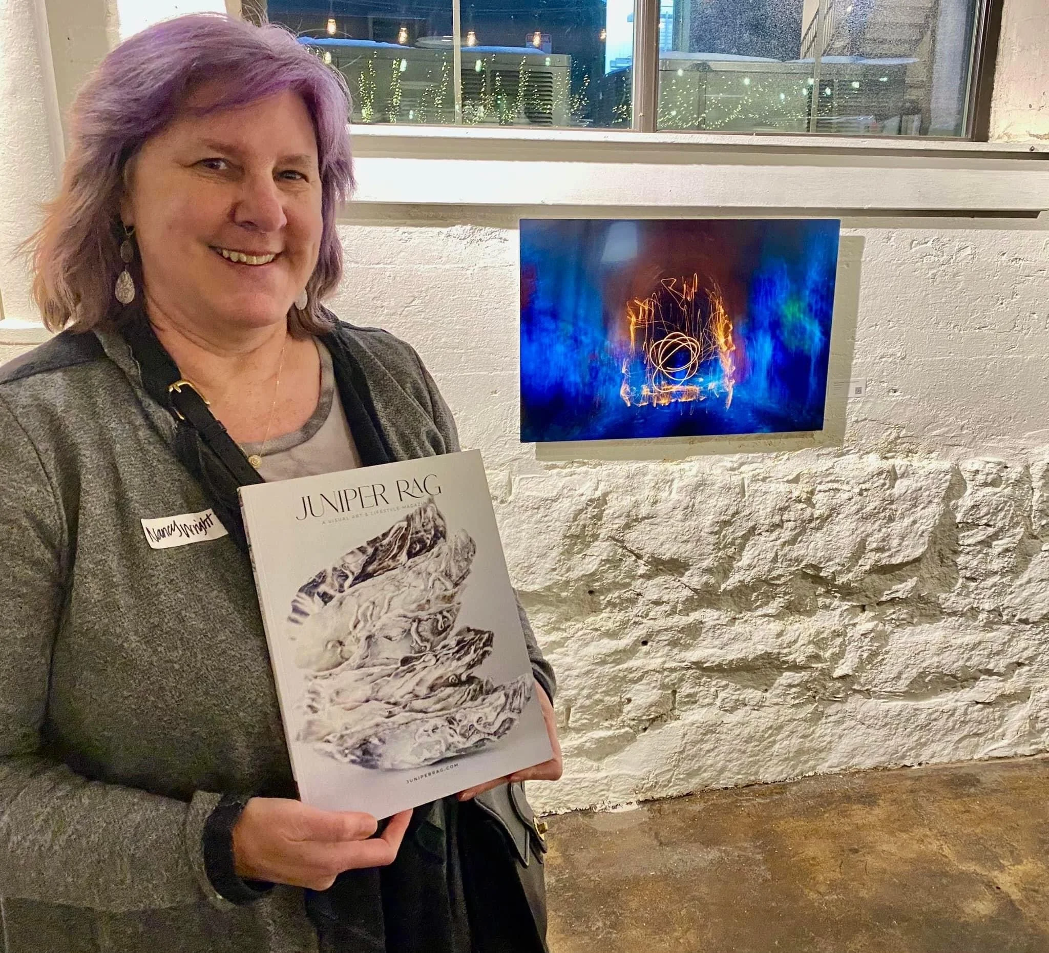 Three people posing in an indoor setting, one holding a magazine titled "Juniper Rag." They are standing in front of artwork on the walls.